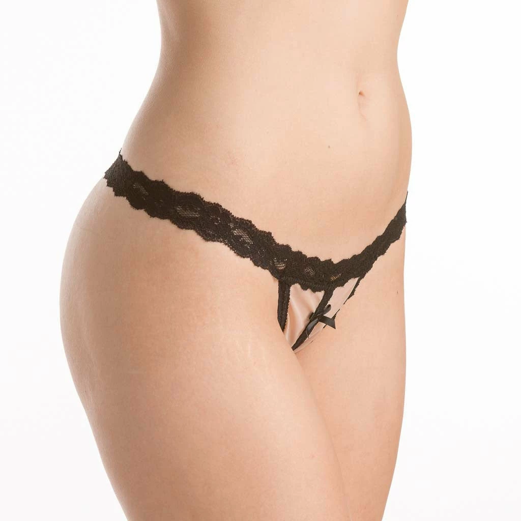 The Hanky Panky 251302 Nude Illusion Crotchless G-String features a scintillating opening which leaves little to the imagination. Made in the USA, this sexy g-string panty has nude sheer, stretch tulle front panels trimmed with black stretch lace. Split crotch with bow accent.