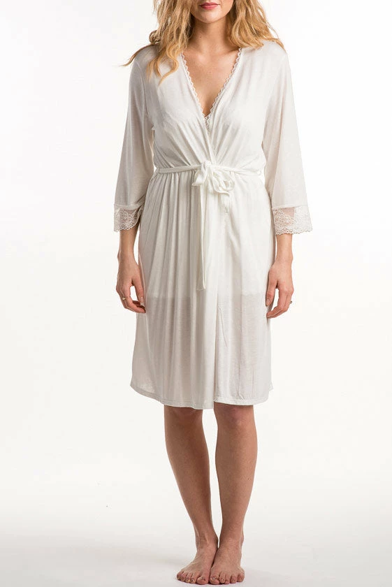 The Hanky Panky Kimono 63R224 is made of a MicroModal® jersey and stretch lace. It has lace trim at the neckline and cuffs and a fabric tie belt. Approximately 40″ long.