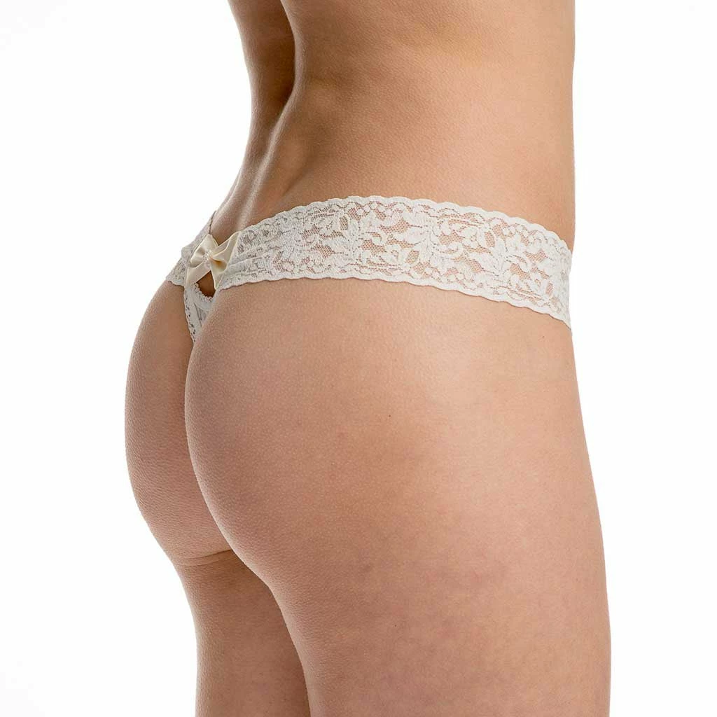 The Hanky Panky Pearl Low Rise Thong 481981 is a low rise thong with the signature stretch lace waistband. A little extra flirt is added with a keyhole opening in the back detailed with a bow.
