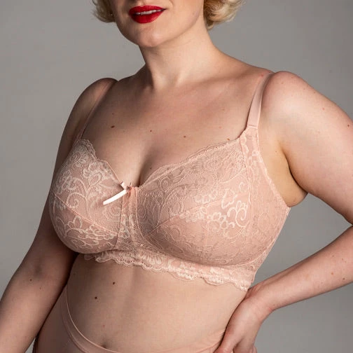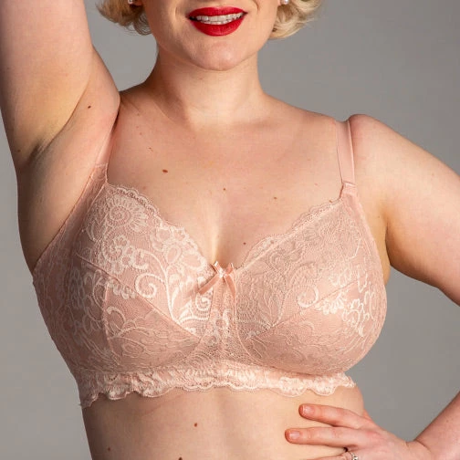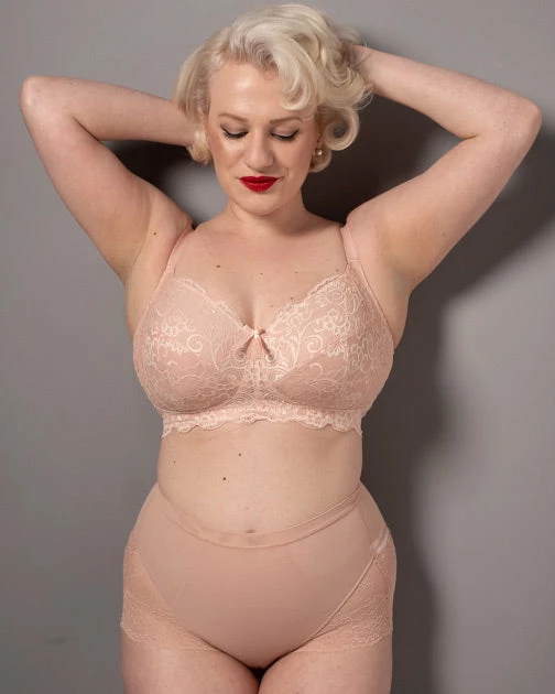 The Panache Andorra Non Wire Full Cup Bra 5671 has 4 sections with stabilizing lined bottom cups and sling to offer a supportive and uplifted fit as well as stretch lace top cups to accommodate the fuller bust. Styled on a cradle and with power mesh wings to provide extra comfort and a supportive fit around the body (up to a H cup). Subtle cross-dyed two-tone lace gives a delicate and feminine appearance to the style.