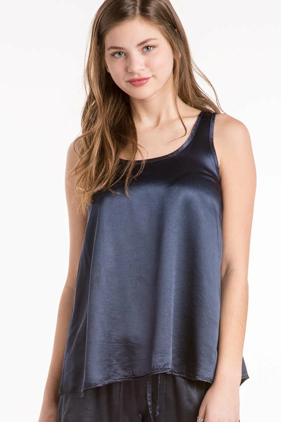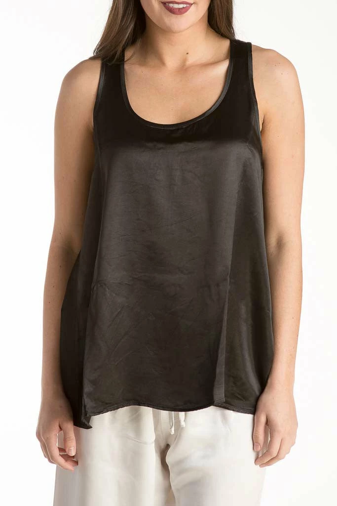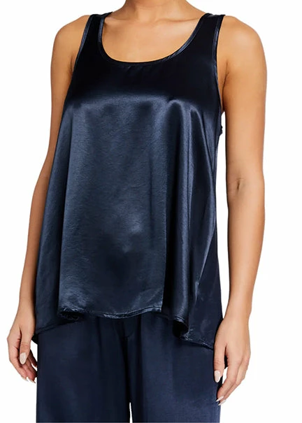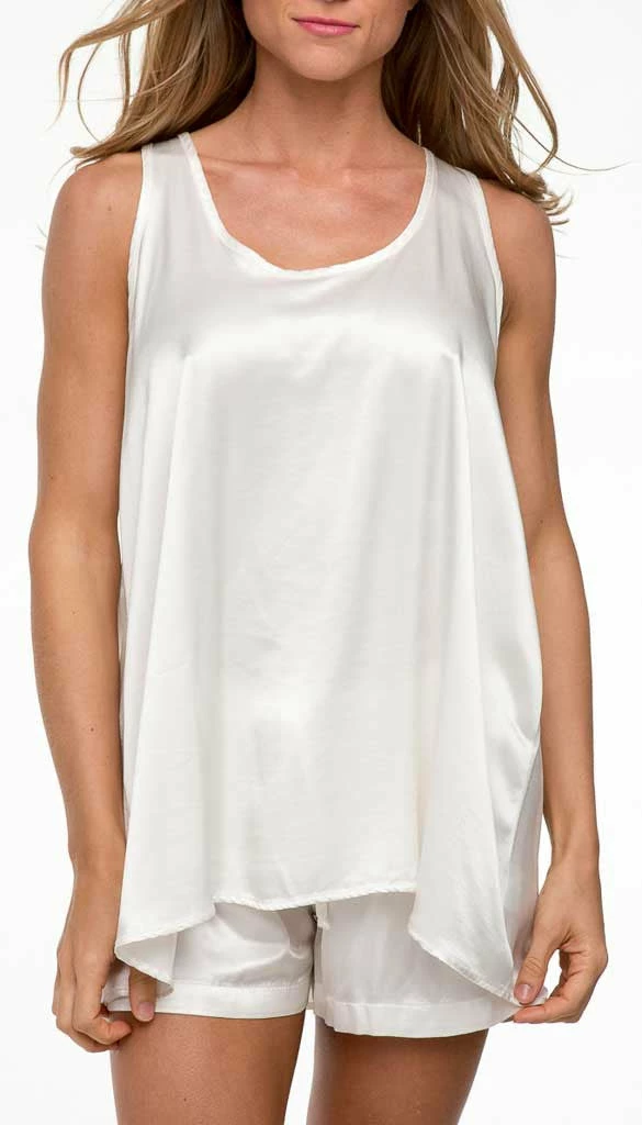 The PJ Harlow LAURA Racerback Swing Tank Top can be worn as a gown with satin boyshorts or as a top with pants. Made with a satin faille blend, this top is loose and flowing with a racer back design.