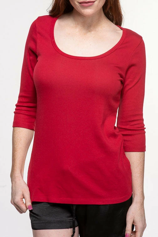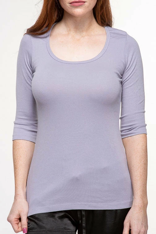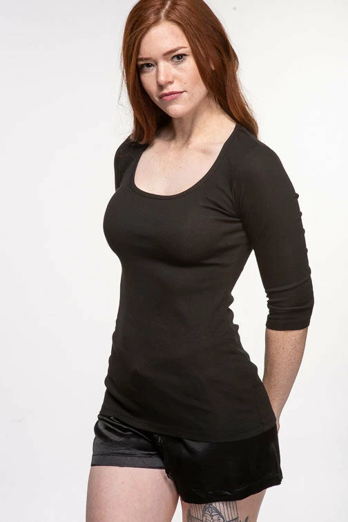 The PJ Harlow T2011 Norah 3/4 Sleeve Tee is made of a Supima cotton and micro-modal knit in a 2X1 rib. The scoop neckline is flattering and the tee is lightweight for year-round wear. Perfect for sleep and lounge. Available in sizes XS-XL.