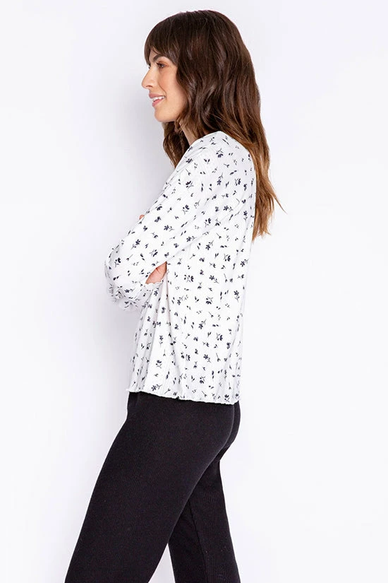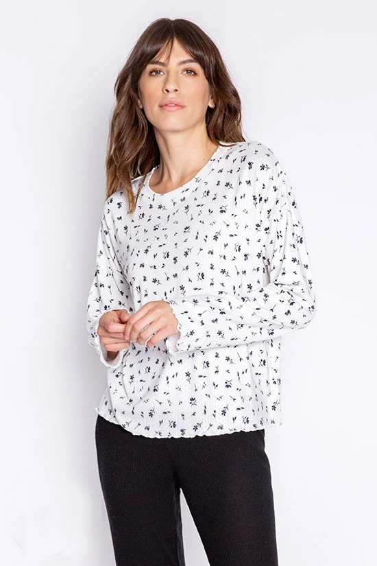 Easy lounging is yours in this relaxed pullover top – designed in a new soft pointelle knit. The PJ Salvage Around The Edges Long Sleeve Top REAELS features ruffled edge hem & sleeves. A perfect sleep layer. This style was made in a Women Empowered Factory (At least 51 percent owned, controlled, or managed by a woman or women.)