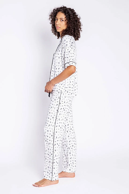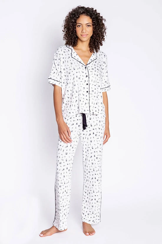 A top-pick pajama set this season, in the softest brushed pointelle knit. The PJ Salvage Around The Edges PJ Set REAEPJ is a classic button front half-sleeve top, with an easy tie-waist pant. This style was made in a Women Empowered Factory (At least 51 percent owned, controlled, or managed by a woman or women.)