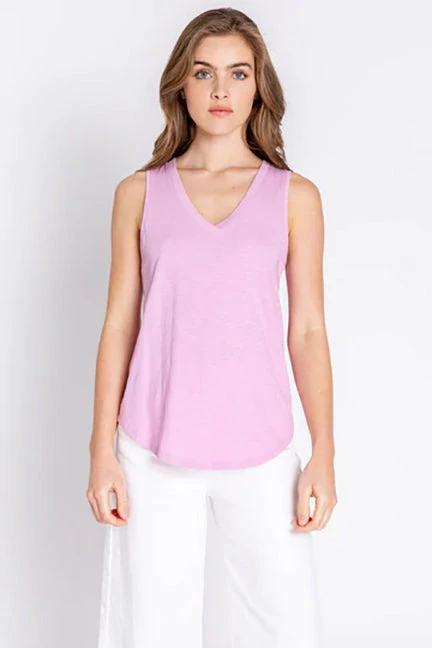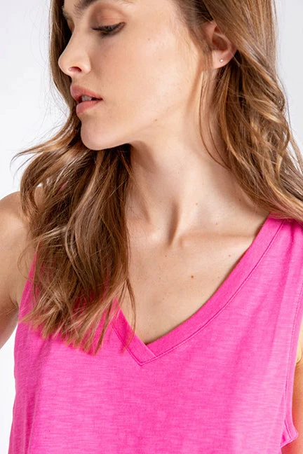 Get your fix of beautiful summer hues in this V-neck tank top, in cotton-blend slub jersey. you’ll love the rib trim and flattering back seam details. Tank has a longer length, with rounded hem.