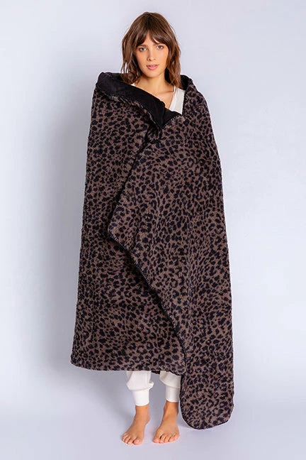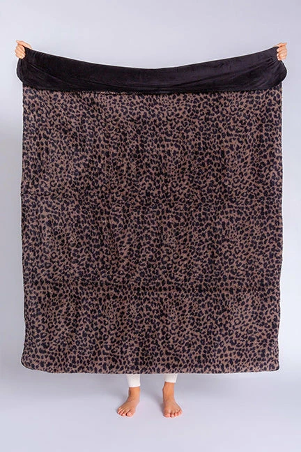 DESCRIPTION:Â Bring a little modern wild into your mix. PJ Salvage’s reversible blanket is a tonal leopard print on one side, with black sheepa fleece on the reverse. A perfect couch throw or for movie nights. Measures 50″ x 65″.