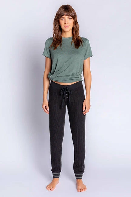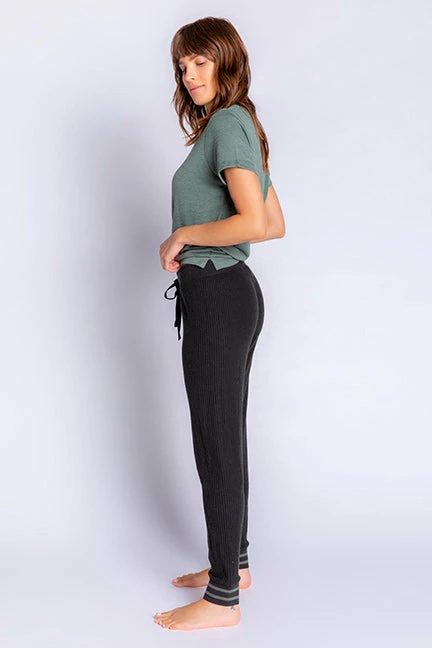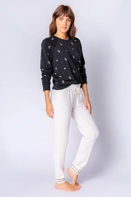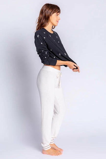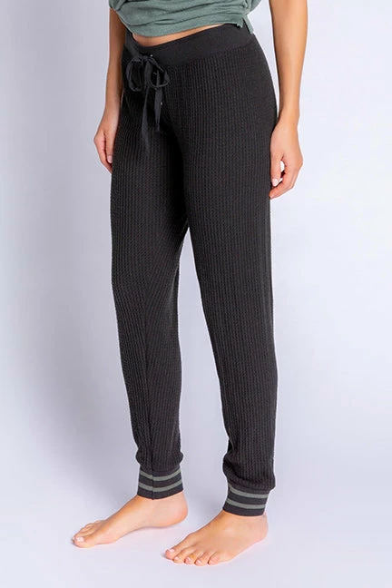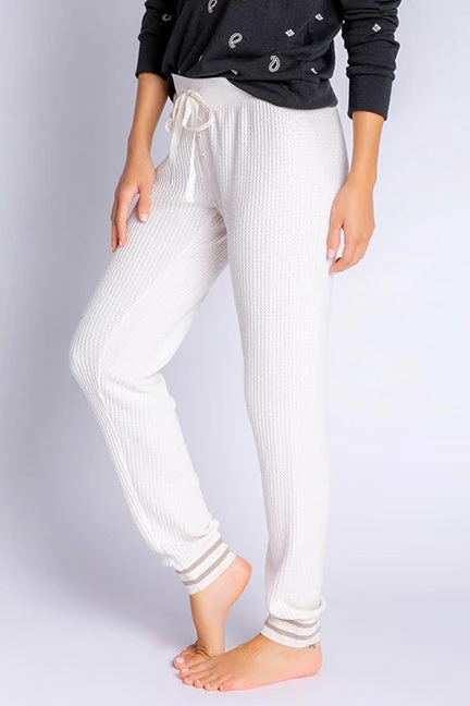 Stone brushed thermal ski jammie pant in with decorative 3-button fly, striped rib cuffs and drawstring waist.