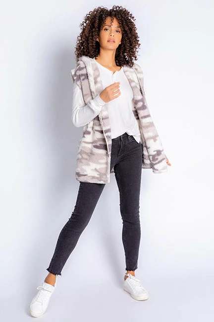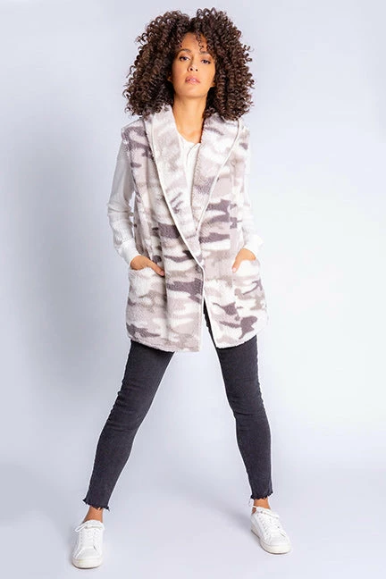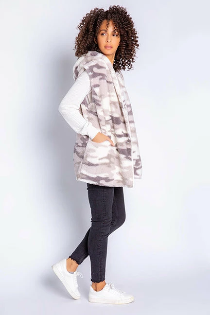Hooded vest in camo-print poly plush fabric. Shawl collar, with single button-front closure and cozy pockets.