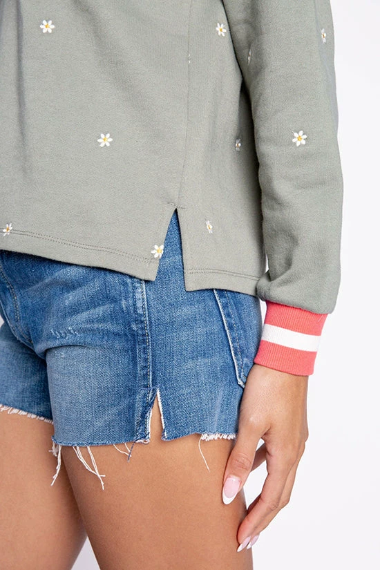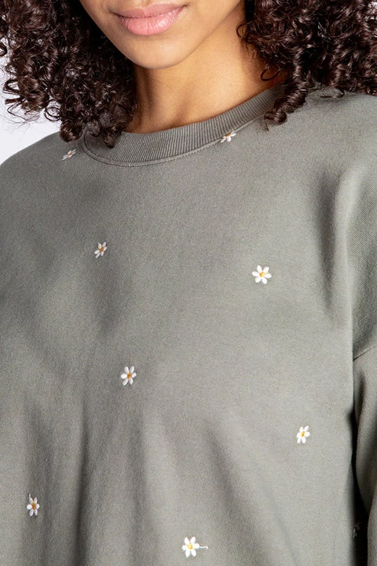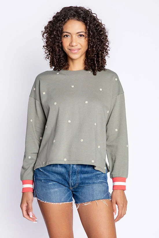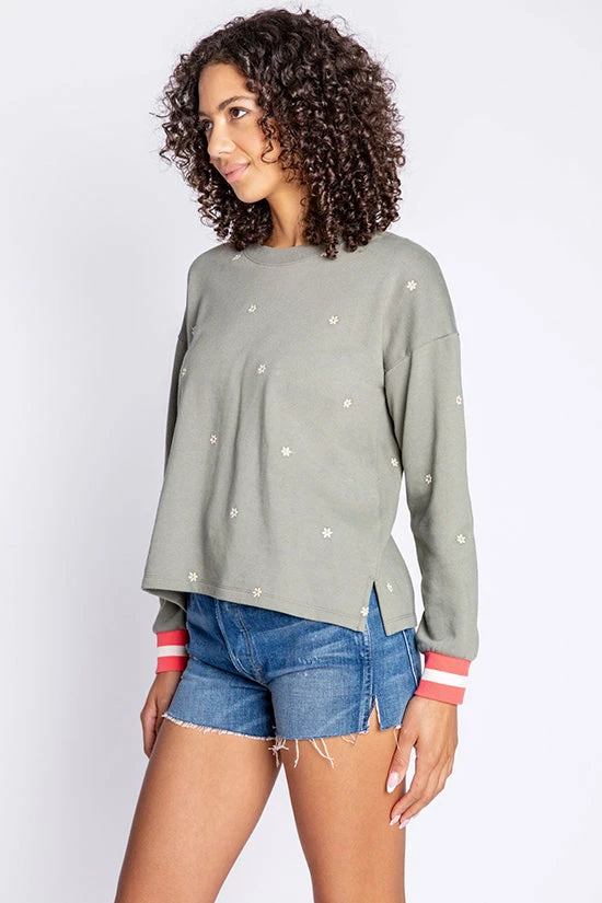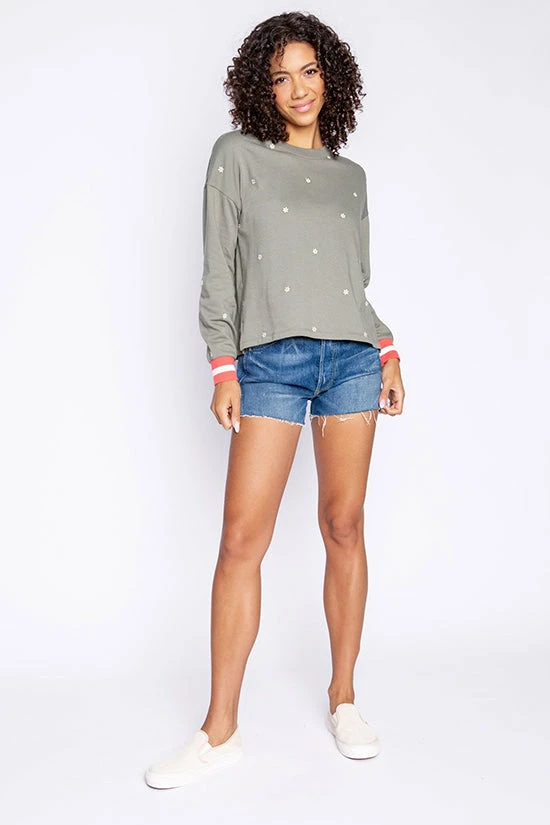 The ultimate travel top, the PJ Salvage Happy Vibes Long Sleeve Top REHVLS in neutral olive, with mini allover embroidered floral pattern. Pop-color striped cuffs are standout details you’ll love to wear.