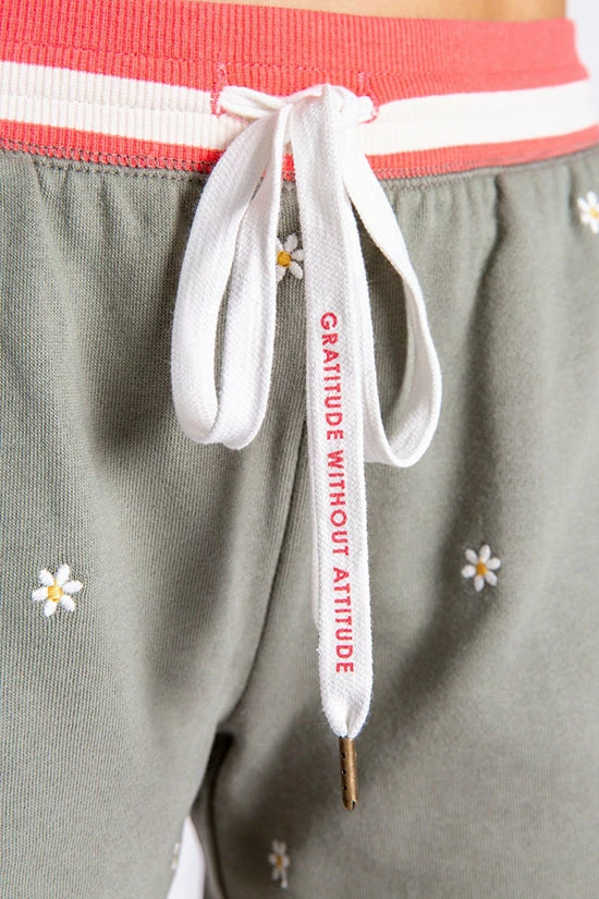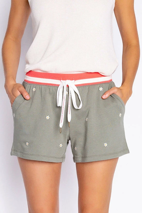 An olive green short in the comfiest length, the PJ Salvage Happy Vibes Short REHVS is a cotton-blend short with mini floral embroidery, and pop-color striped rib waist. We love the comfy side pockets!