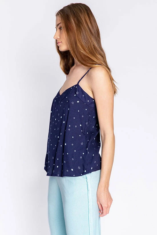 Micro stars printed on a breezy woven crepe camisole top like a starry sky. We love the PJ Salvage Midnight Sky Cami REMSC with elastic back & adjustable straps for a comfy fit. This style was made in a Women Empowered Factory (At least 51 percent owned, controlled, or managed by a woman or women.)