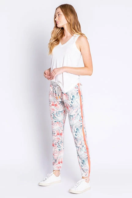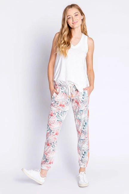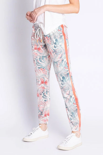 Be adventure-ready with PJ Salvage’s exotic plant-inspired print jogger pant. Statement pant with distressed, neon side stripes & side pockets (and cute back patch pocket!)