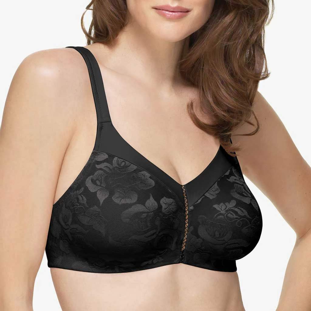 The Wacoal Awareness Soft Cup Bra 85276 is a wireless full coverage bra that is ideal for full busted figures. Constructed of a soft, stretch nylon, the double-layer cups are adorned with floral mesh. Wide straps provide comfortable support and their close-set design prevents slippage. This bra is part of the Breast Cancer Awareness Collection and comes with breast self-exam instructions.