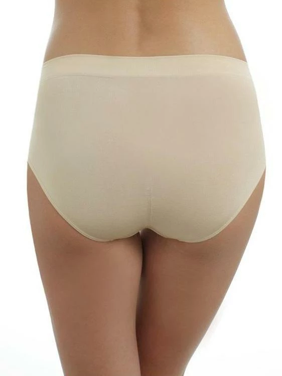 This is a hi-cut leg, seamless brief made with smooth nylon/Lycra® supportive fabric. Totally seamless body includes ruching knitted in the derriere. Your clothes will glidee easily over the panty for a sleek look. Hand wash warm with like colors. Line dry.