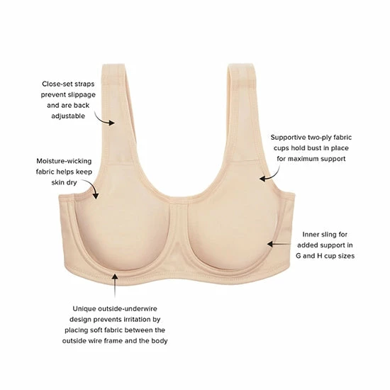 A sport bra like no other! The Wacoal Sport Underwire Bra 855170 is a workout bra with a unique outside underwire which minimizes bounce even during high-impact activities while it also delivers everyday comfort, so you never miss a beat! This underwire sport bra was specially designed to keep up with you no matter what moves you make.