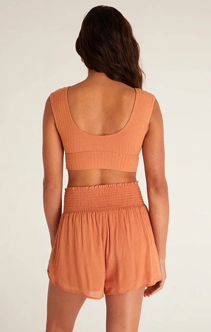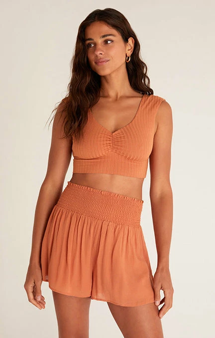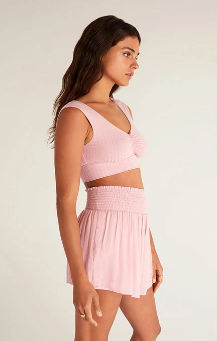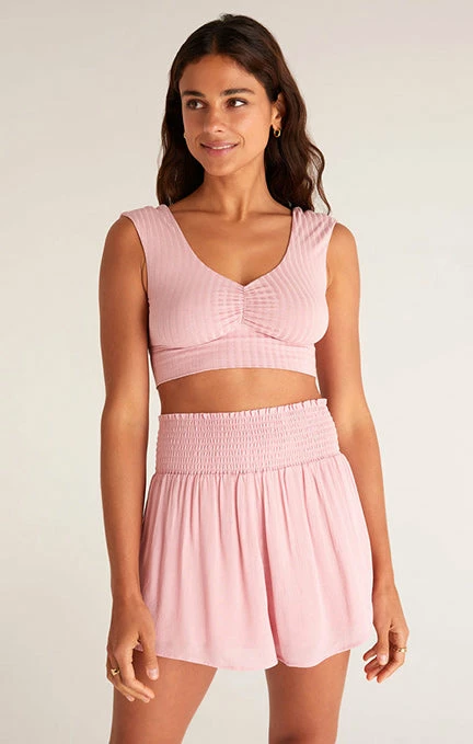 Not your usual tank bra! The Hazey Rib Tank Bra is made from Z Lounge’s comfy rib fabric, with a design twist for the season. More of a cami feel, this cute bralette has shirring at the center and elastin for a snug fit. Pair it with the Dawn Crinkle Short for a flawless matching look.